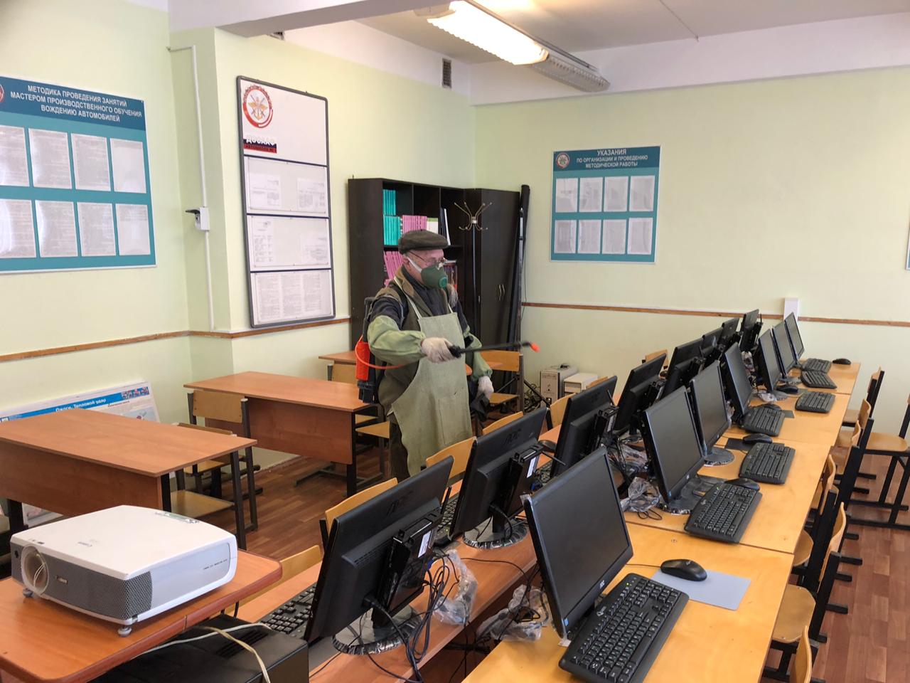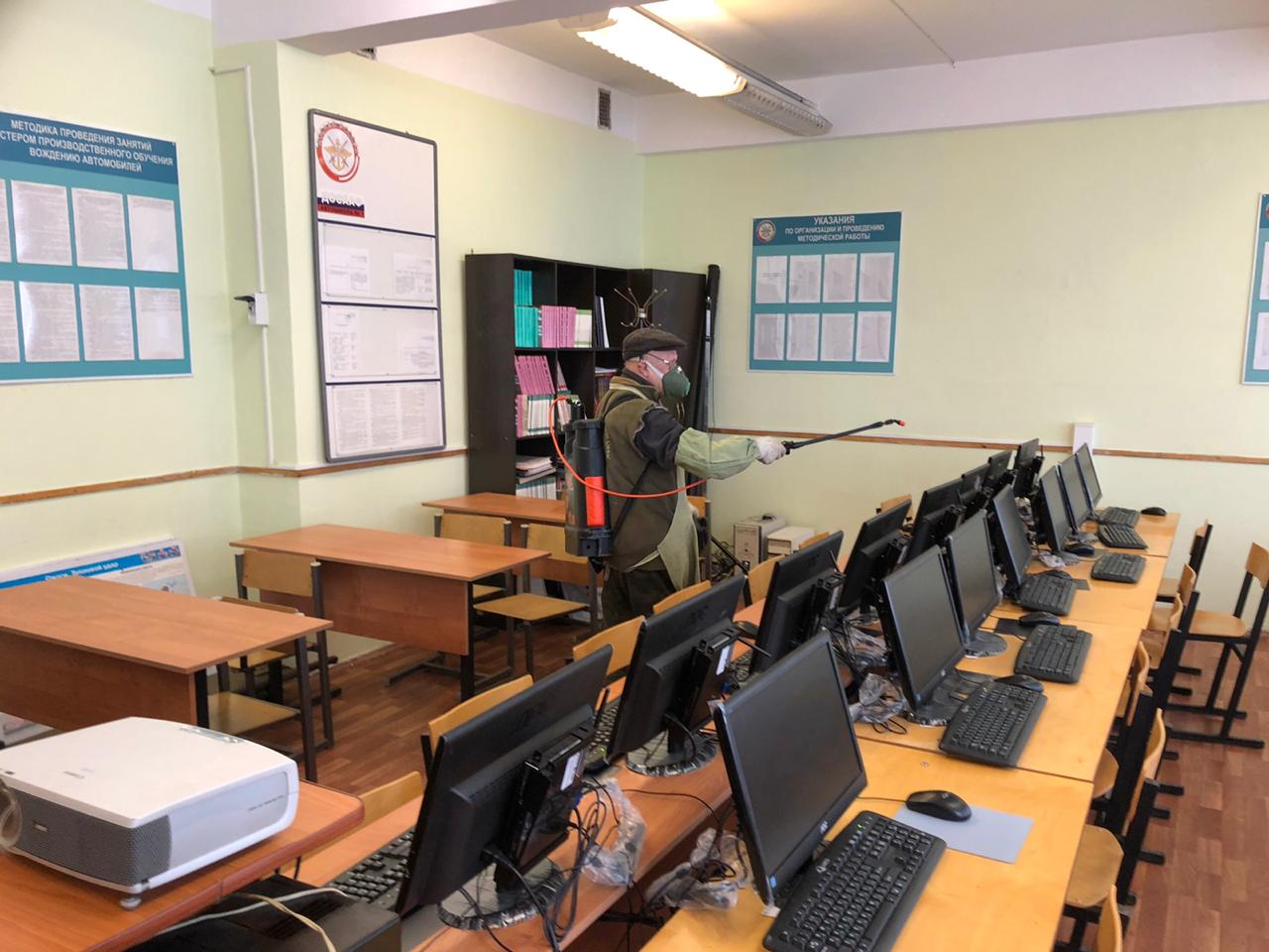 В ПОУ Мичуринской АШ ООГО ДОСААФ России , Тамбовской области и в Местном отделении ООГО ДОСААФ России г. Мичуринска проводятся мероприятия по профилактике и обеззараживанию учебных классов, мест общего пользования и техники.